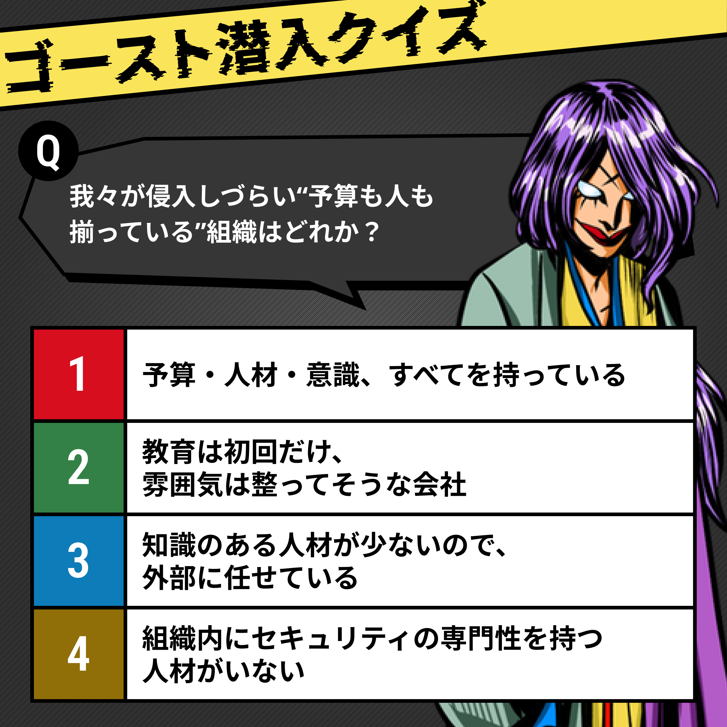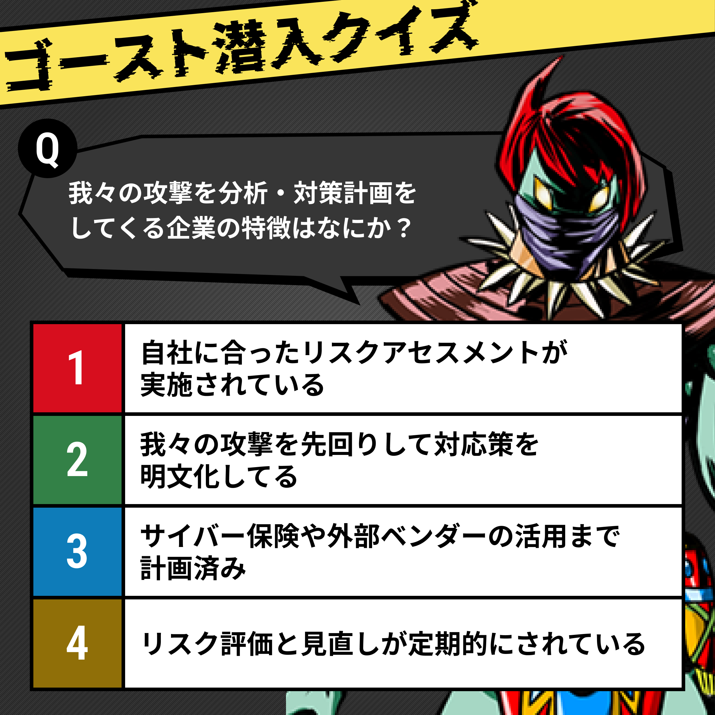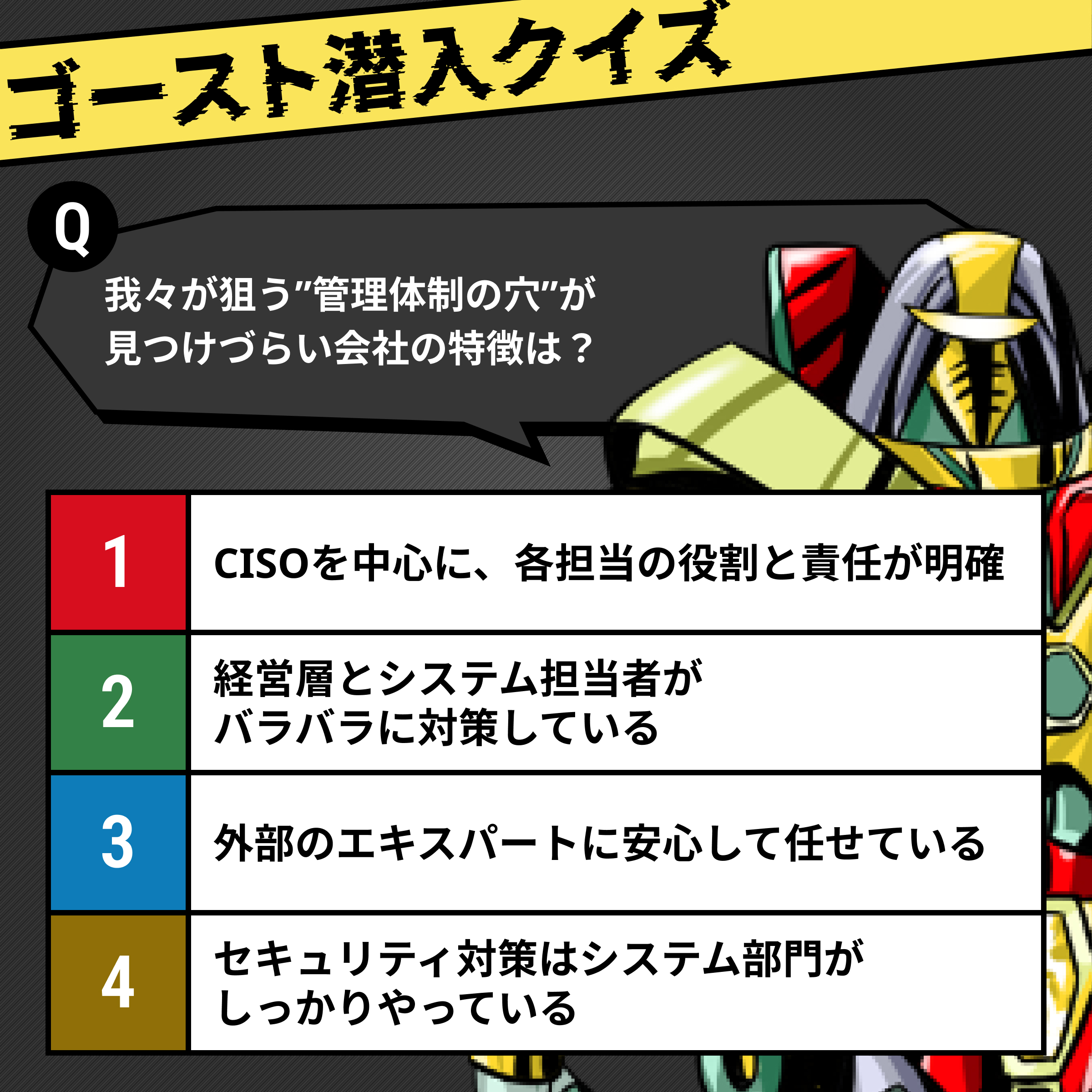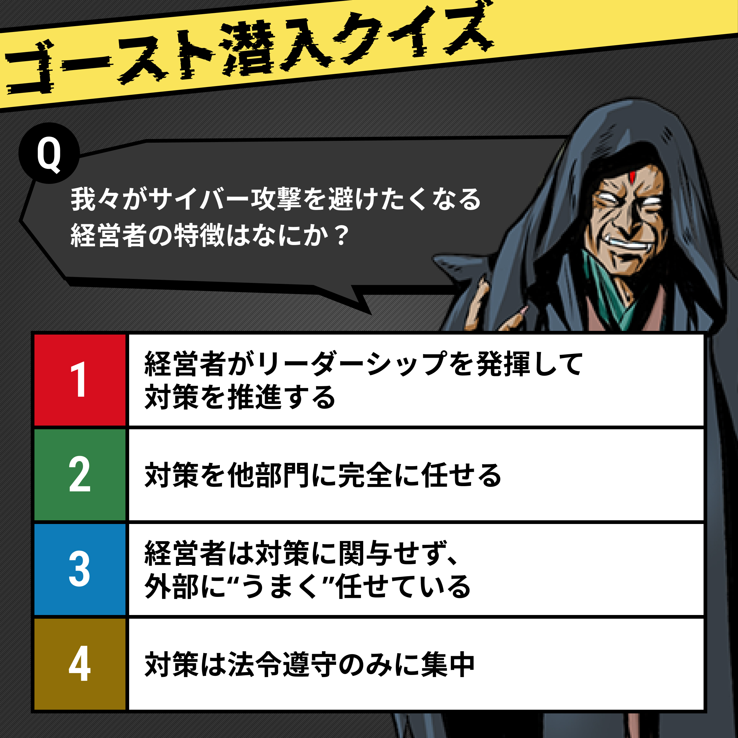 我々サイバーゴーストが最も好むのは、経営者が無関心な企業だ。対策が他部門任せだと、そこに隙間が生まれる。しかし、経営者がリーダーシップを発揮すれば、我々の侵入も一筋縄ではいかなくなる。